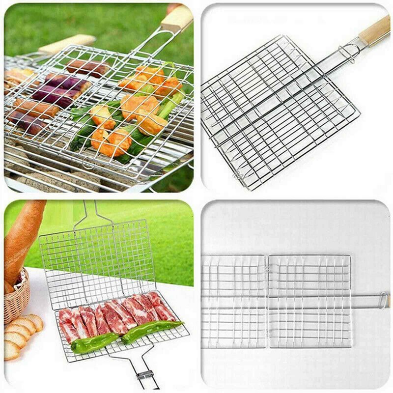 • SAFE AND EASY TO CLEAN: Long wooden handle keeps hands away from the hot grill. Easy to clean BBQ grill allows you to keep food firmly in place for easy turning and prevents the food from sticking to the grill.